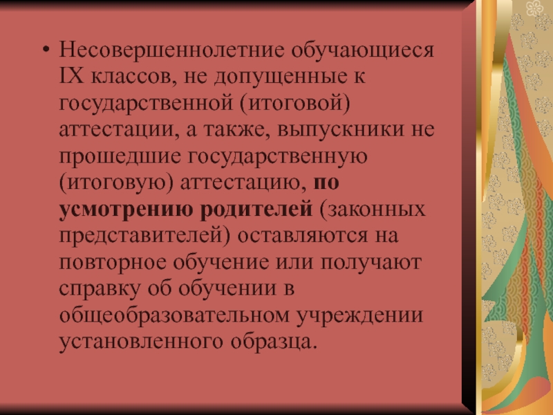 Слайд 13Несовершеннолетние обучающиеся IX классов, не допущенные к государственной (итоговой) аттестации, а