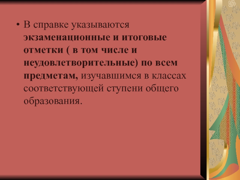 Слайд 14В справке указываются экзаменационные и итоговые отметки ( в том числе