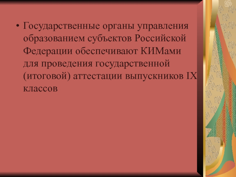 Слайд 8Государственные органы управления образованием субъектов Российской Федерации обеспечивают КИМами для проведения