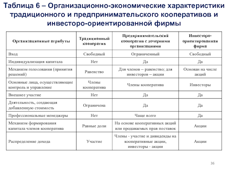 Слайд 36Таблица 6 – Организационно-экономические характеристики традиционного и предпринимательского кооперативов и инвесторо-ориентированной