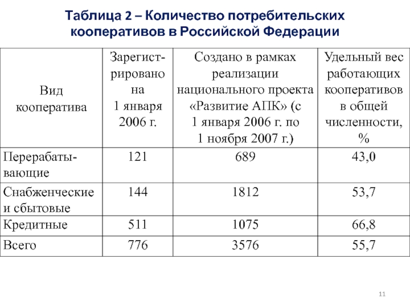 Слайд 11Таблица 2 – Количество потребительских кооперативов в Российской Федерации