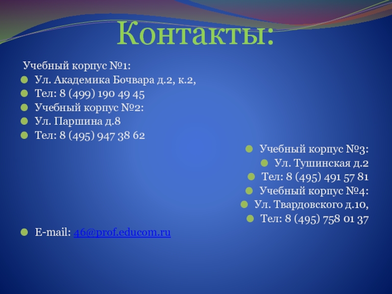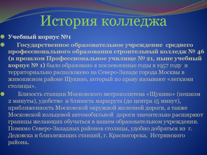 образования строительный колледж № 46 (в прошлом Профессиональное училище № 21, ныне учебный корпус № 1) было образовано в послевоенные годы в 1957 году и территориально расположено на Северо-Западе города Москвы в живописном районе Щукино, который по праву называют «легкими столицы».