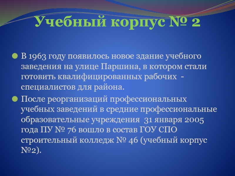 После реорганизаций профессиональных учебных заведений в средние профессиональные образовательные учреждения 31 января 2005 года ПУ № 76 вошло в состав ГОУ СПО строительный колледж № 46 (учебный корпус №2).