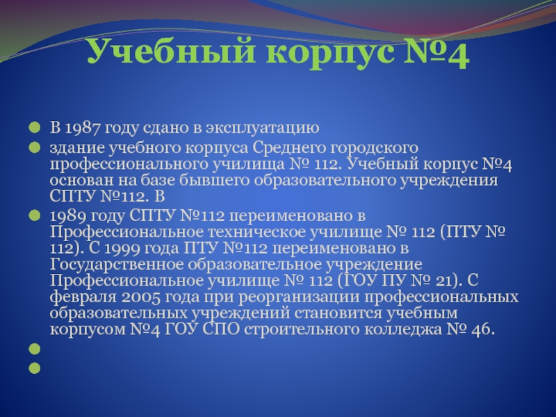 Среднего городского профессионального училища № 112. Учебный корпус №4 основан на базе бывшего образовательного учреждения СПТУ №112. В