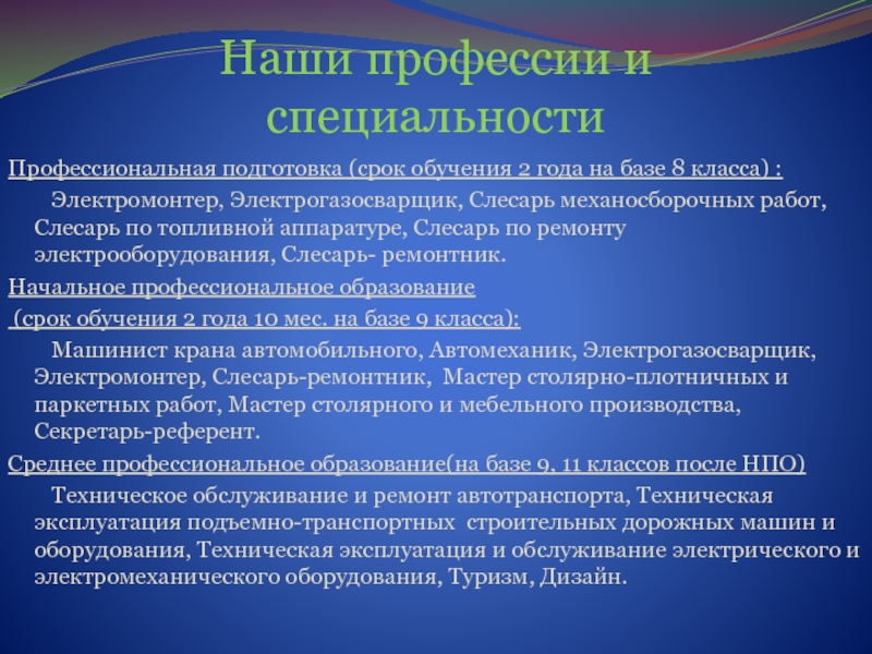 Техническое обслуживание и ремонт автотранспорта, Техническая эксплуатация подъемно-транспортных строительных дорожных машин и оборудования, Техническая эксплуатация и обслуживание электрического и электромеханического оборудования, Туризм, Дизайн.