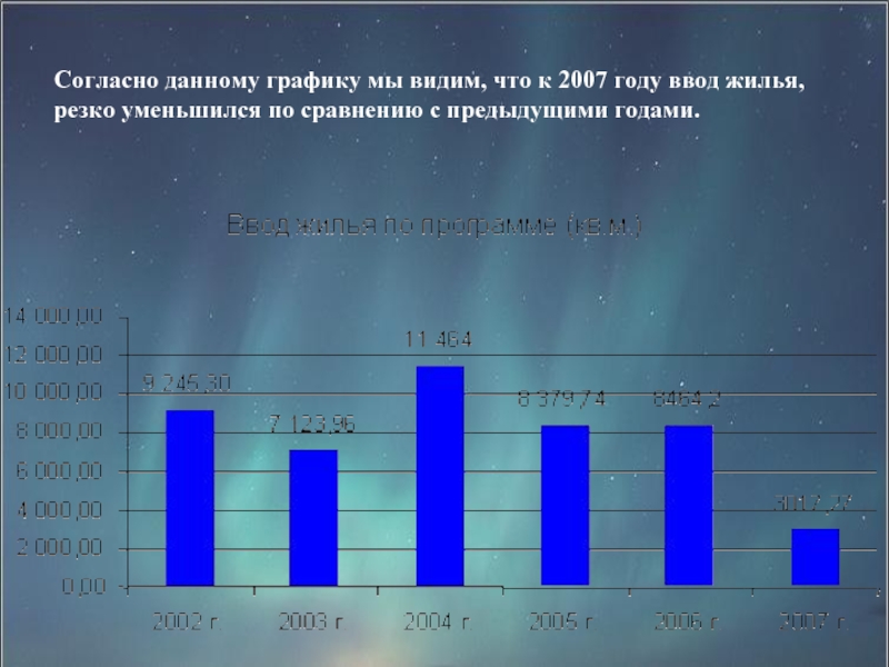 Слайд 20Согласно данному графику мы видим, что к 2007 году ввод жилья,