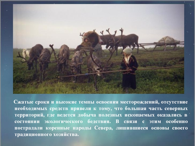 средств привели к тому, что большая часть северных территорий, где ведется добыча полезных ископаемых оказались в состоянии экологического бедствия. В связи с этим особенно пострадали коренные народы Севера, лишившиеся основы своего традиционного хозяйства.