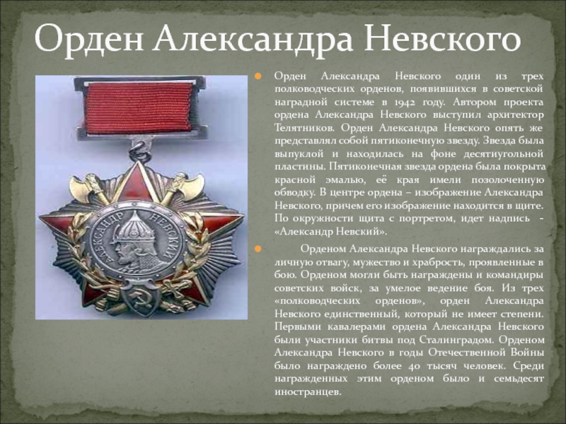 в советской наградной системе в 1942 году. Автором проекта ордена Александра Невского выступил архитектор Телятников. Орден Александра Невского опять же представлял собой пятиконечную звезду. Звезда была выпуклой и находилась на фоне десятиугольной пластины. Пятиконечная звезда ордена была покрыта красной эмалью, её края имели позолоченную обводку. В центре ордена – изображение Александра Невского, причем его изображение находится в щите. По окружности щита с портретом, идет надпись - «Александр Невский».