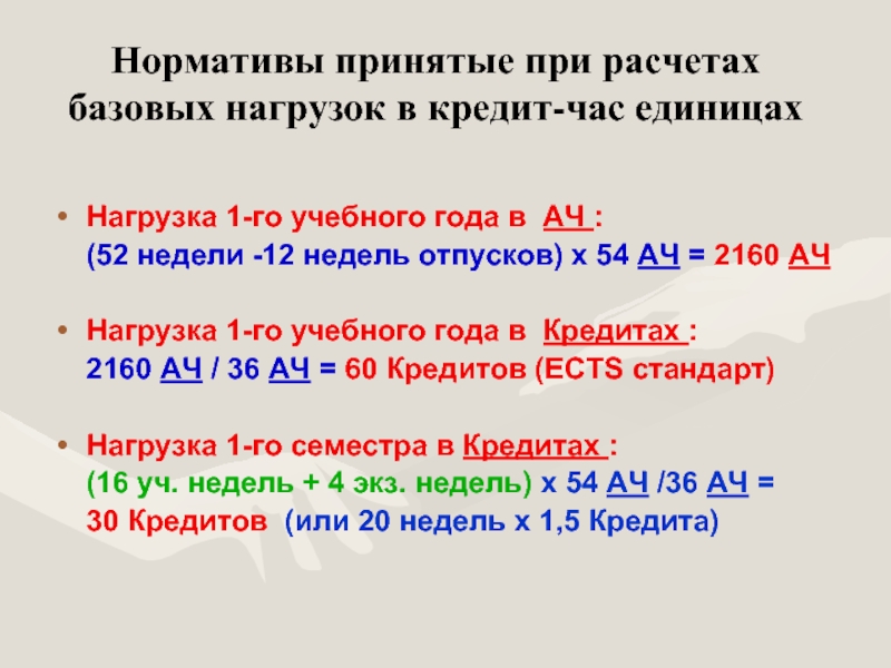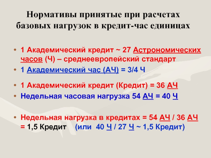 Слайд 6Нормативы принятые при расчетах базовых нагрузок в кредит-час единицах