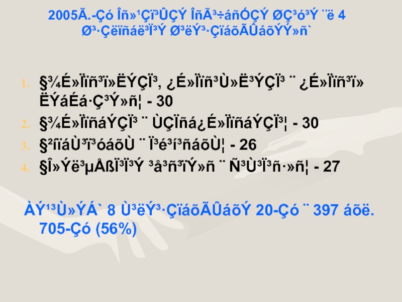 Слайд 412005Ã.-Çó Îñ»¹Çï³ÛÇÝ Îñó÷áñÓÇÝ ØÇ³ó³Ý ¨ë 4 س·Çëïñáë³Ï³Ý سëݳ·ÇïáõÃÛáõÝÝ»ñ`