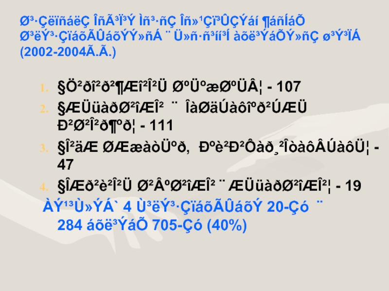 Слайд 40س·ÇëïñáëÇ ÎñÃ³Ï³Ý Ìñ³·ñÇ Îñ»¹Çï³ÛÇÝáí ¶áñÍáÕ Ø³ëݳ·ÇïáõÃÛáõÝÝ»ñÁ ¨ Ü»ñ·ñ³íí³Í àõë³ÝáÕÝ»ñÇ ø³Ý³ÏÁ (2002-2004Ã.Ã.)