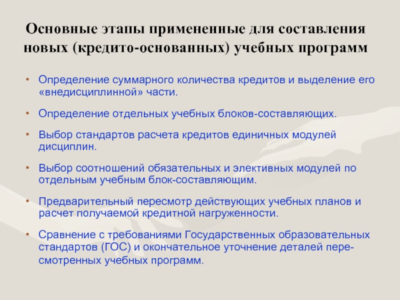Слайд 4Основные этапы примененные для составления новых (кредито-основанных) учебных программ