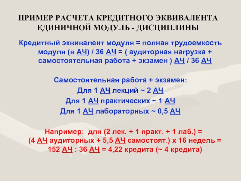 Слайд 13ПРИМЕР РАСЧЕТА КРЕДИТНОГО ЭКВИВАЛЕНТА ЕДИНИЧНОЙ МОДУЛЬ - ДИСЦИПЛИНЫ