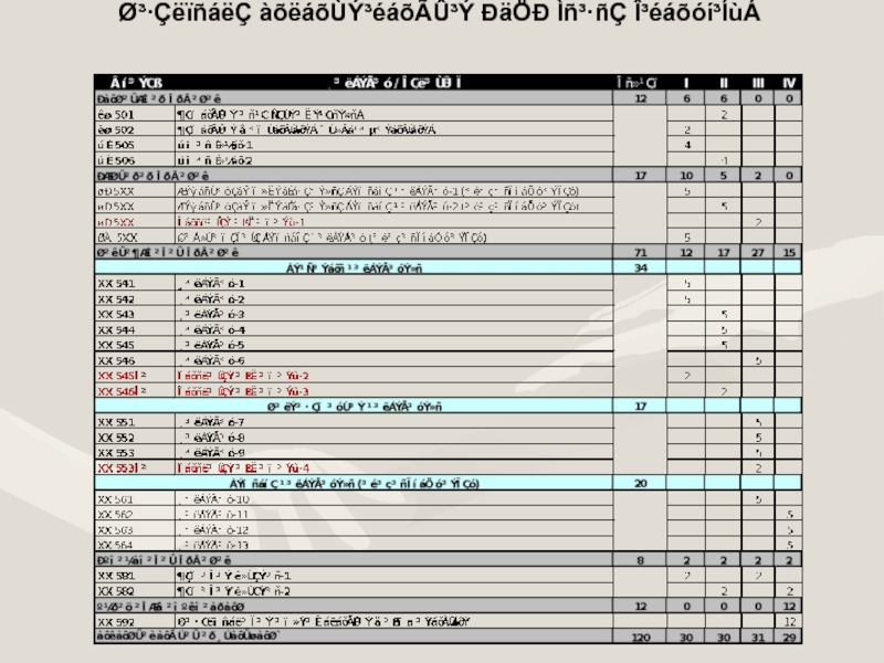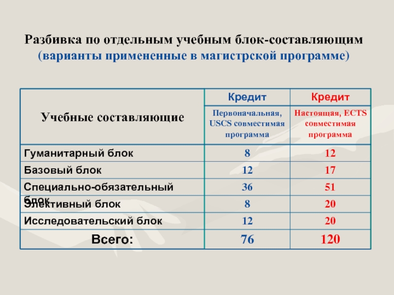 Слайд 10Разбивка по отдельным учебным блок-составляющим (варианты примененные в магистрской