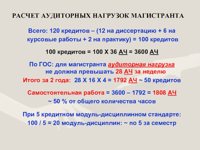 Например: для (2 лек. + 1 практ. + 1 лаб.) = (4 АЧ аудиторных + 5,5 АЧ самостоят.) x 16 недель = 152 АЧ : 36 АЧ = 4,22 кредита (~ 4 кредита)