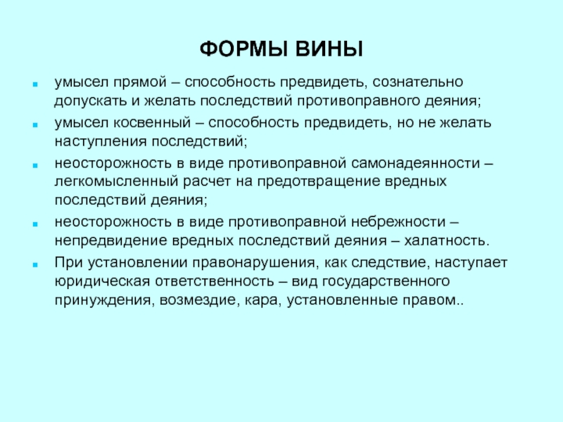 умысел прямой – способность предвидеть, сознательно допускать и желать последствий