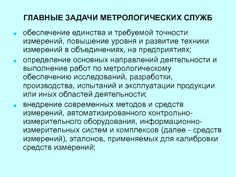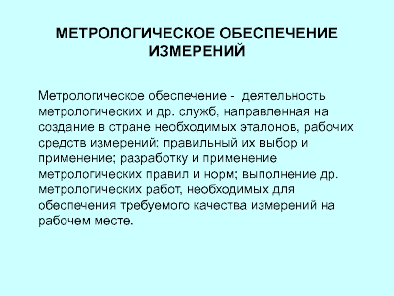 служб, направленная на создание в стране необходимых эталонов, рабочих средств измерений; правильный их выбор и применение; разработку и применение метрологических правил и норм; выполнение др. метрологических работ, необходимых для обеспечения требуемого качества измерений на рабочем месте.