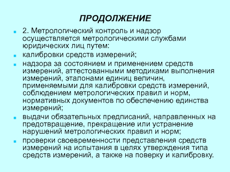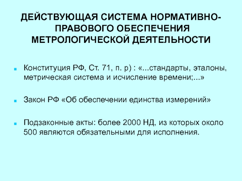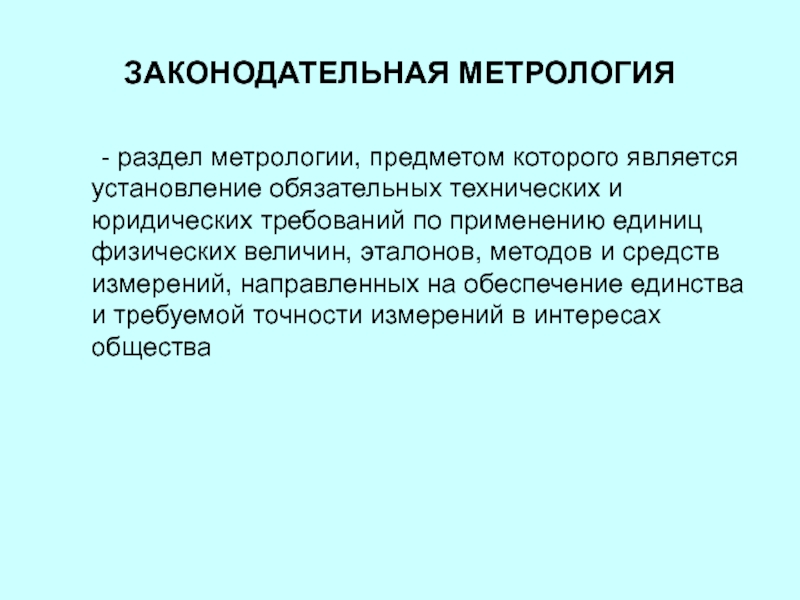 Законодательная метрология – раздел метрологии, предметом которого является установление обязательных технических и юридических требований по применению единиц физических величин, эталонов, методов и средств измерений, направленных на обеспечение единства и необходимости точности измерений в интересах общества.