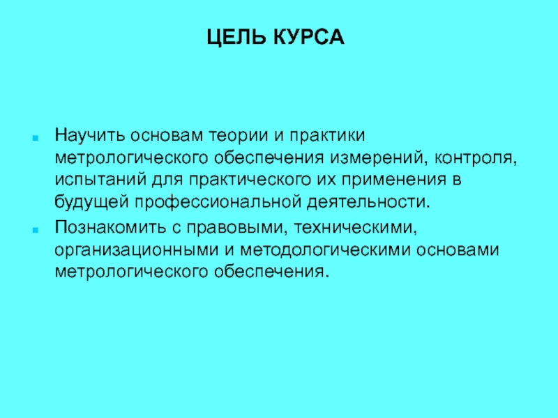 Познакомить с правовыми, техническими, организационными и методологическими основами метрологического обеспечения.