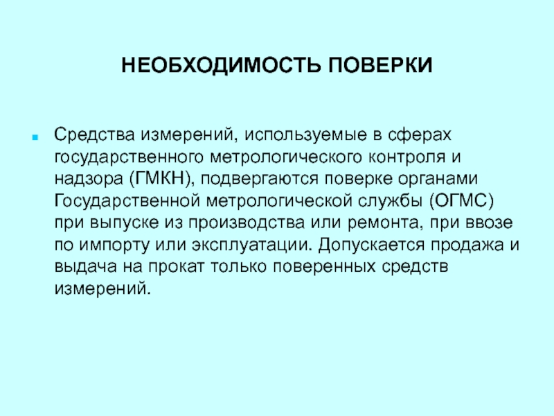 и надзору, подвергаются поверке органами Государственной метрологической службы при выпуске из производства или ремонта, при ввозе по импорту и эксплуатации. Допускается продажа и выдача напрокат только поверенных средств измерений.