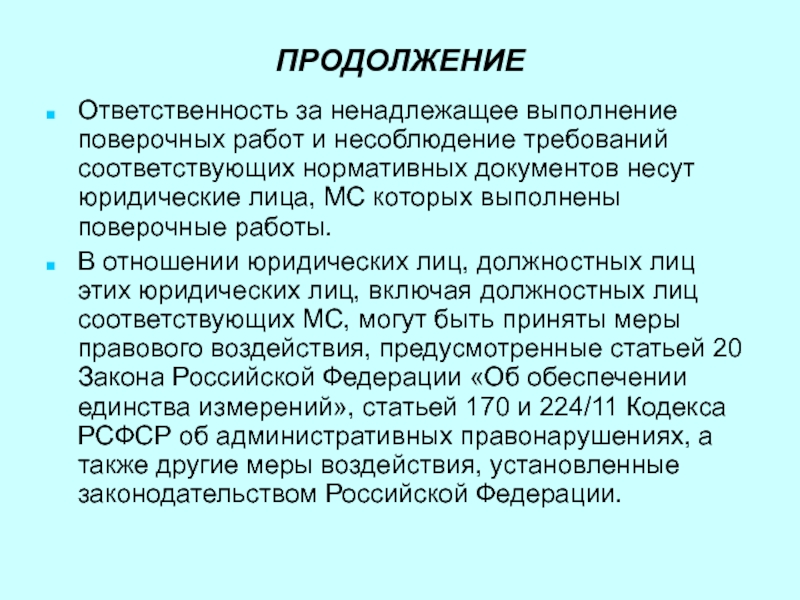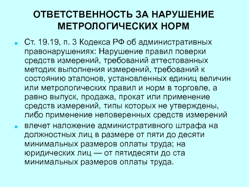 Слайд 270ОТВЕТСТВЕННОСТЬ ЗА НАРУШЕНИЕ МЕТРОЛОГИЧЕСКИХ НОРМ