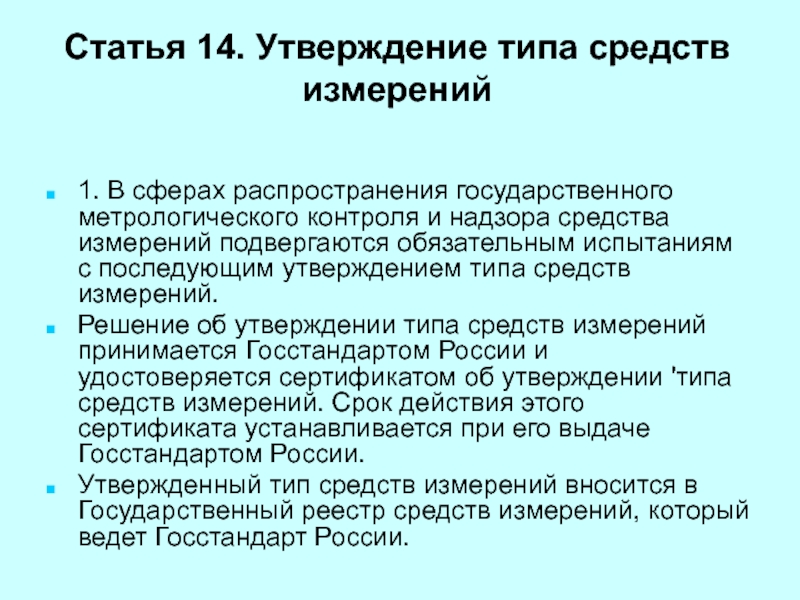 Слайд 255Статья 14. Утверждение типа средств измерений