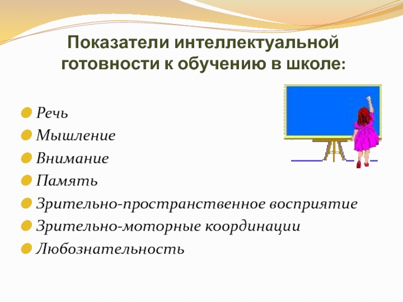 Слайд 9Показатели интеллектуальной готовности к обучению в школе: