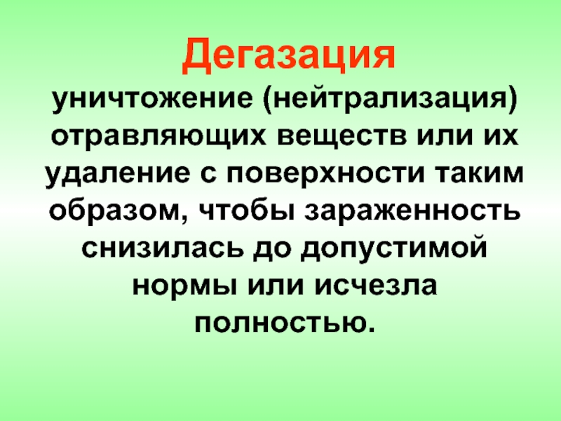 Дегазация (нейтрализация) - обеззараживание объектов, зараженных ОВ (ОХВ).