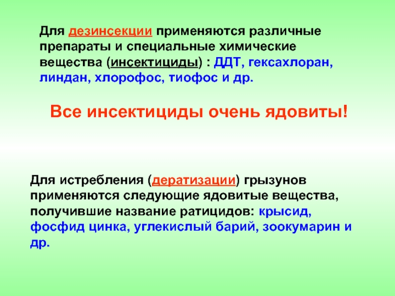 Слайд 29Для дезинсекции применяются различные препараты и специальные химические вещества (инсектициды) :