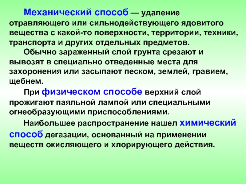 Слайд 19Механический способ — удаление отравляющего или сильнодействующего ядовитого вещества с какой-то