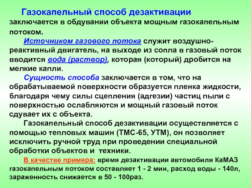 Слайд 15Газокапельный способ дезактивации заключается в обдувании объекта мощным газокапельным потоком.