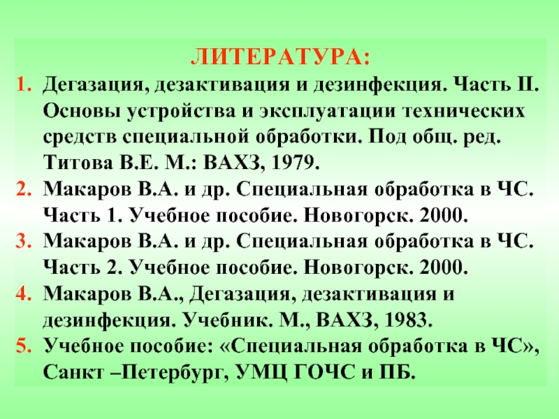 Макаров В.А., Дегазация, дезактивация и дезинфекция. Учебник. М., ВАХЗ, 1983.