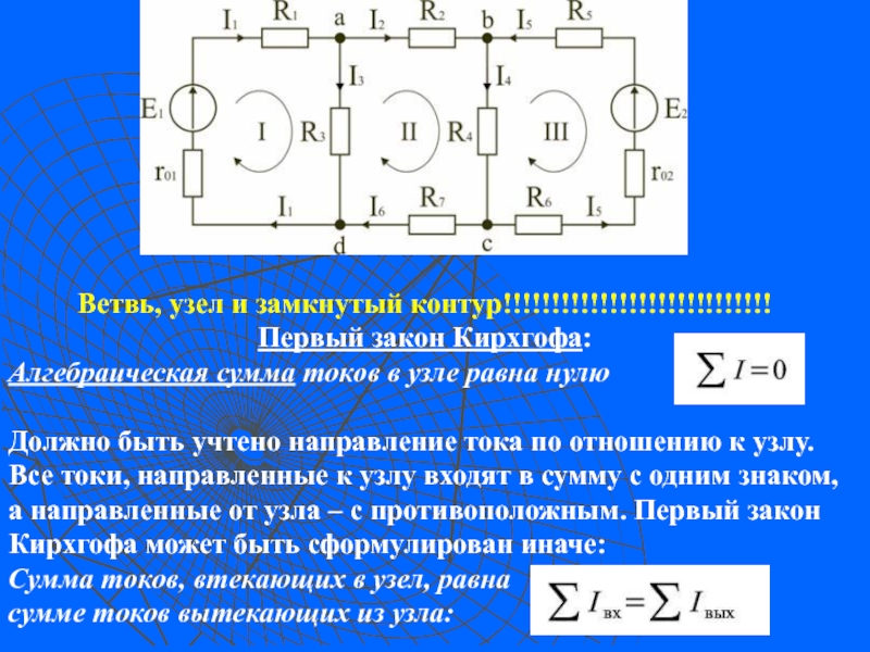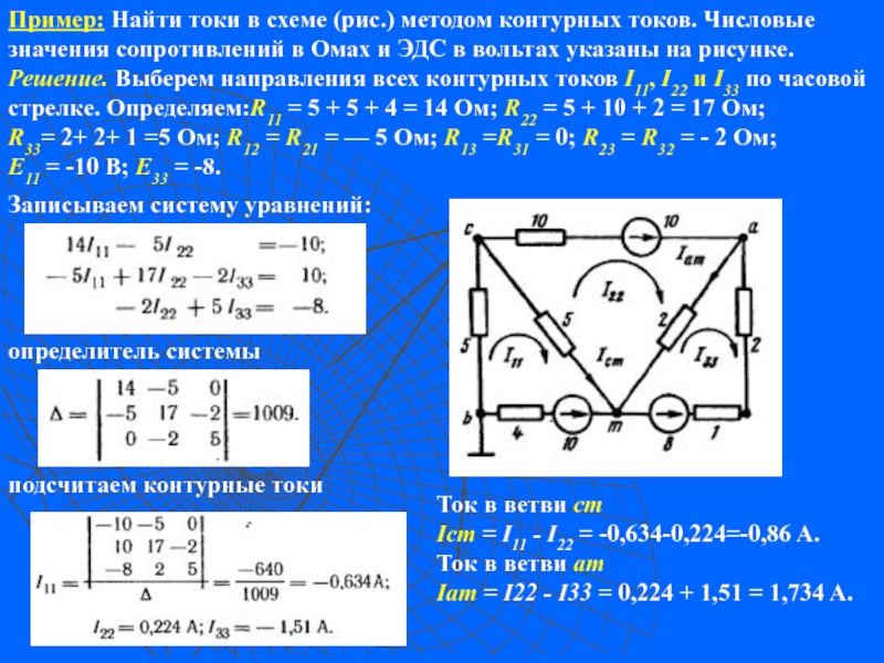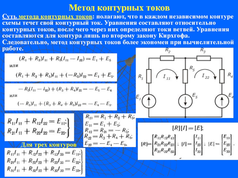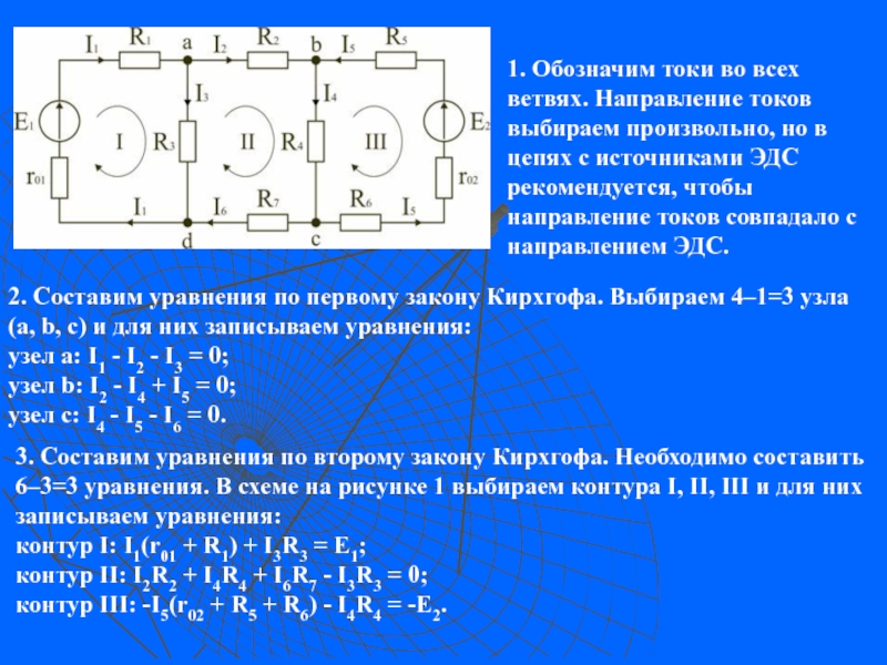 На основании законов Кирхгофа составляются уравнения для неизвестных токов в ветвях. Система полученных уравнений линейна, ее решение позволяет найти неизвестные токи в ветвях цепи.