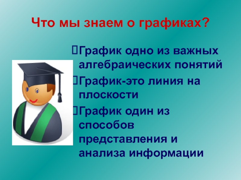 Графиком называется множество точек координатной плоскости, у которых значения х и y связаны некоторой зависимостью и каждому значению х соответствует единственное значение у.