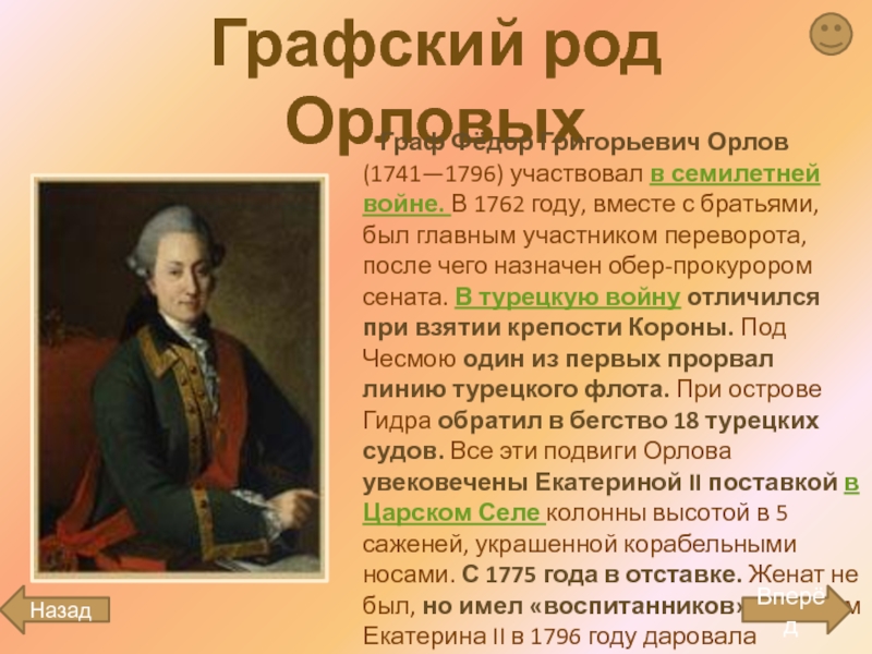 Под Чесмою истребил турецкий флот и тем открыл путь к завоеванию архипелага.