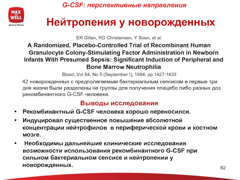 Необходимы дальнейшие клинические исследования возможности использования рекомбинантного G-CSF при сильном бактериальном сепсисе и нейтропении у новорожденных.