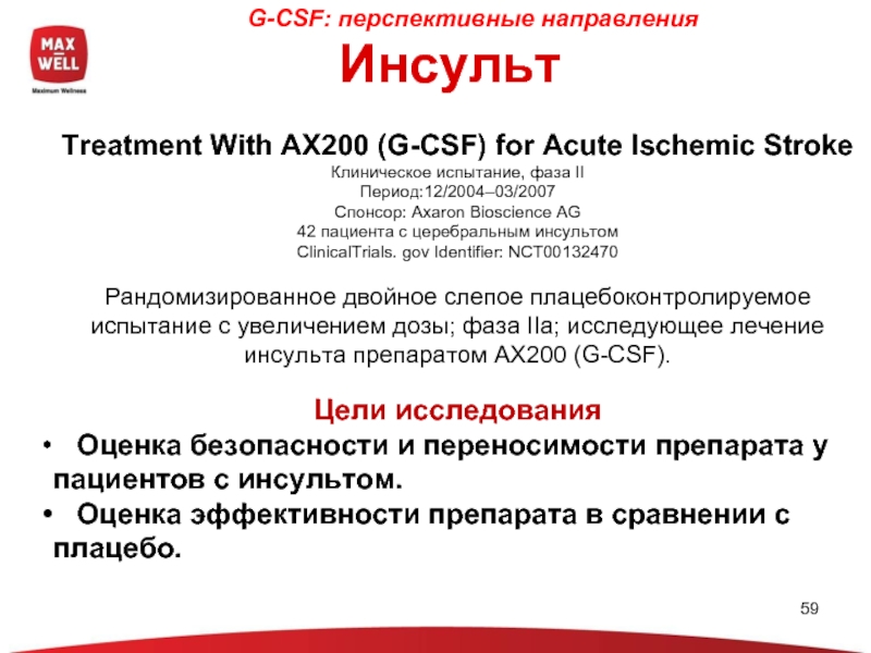 Слайд 59Treatment With AX200 (G-CSF) for Acute Ischemic Stroke