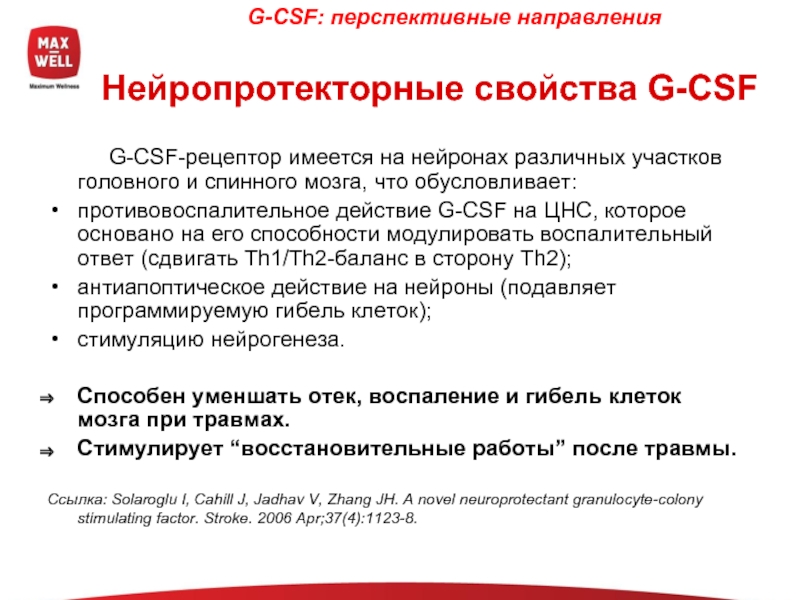 Ссылка: Solaroglu I, Cahill J, Jadhav V, Zhang JH. A novel neuroprotectant granulocyte-colony stimulating factor. Stroke. 2006 Apr;37(4):1123-8.