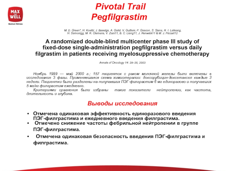 Ноябрь 1999 — май 2000 г.; 157 пациенток с раком молочной железы были включены в исследование 3 фазы. Применявшаяся схема химиотерапии: доксорубицин-доксетаксел каждые 3 недели. Пациентки были разделены на получавших ПЭГ-филграстим 6 мг единоразово и получавших 5 мг/кг филграстим ежедневно.