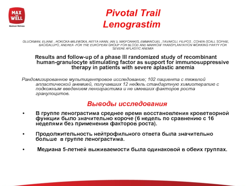 Рандомизированное мультицентровое исследование; 102 пациента с тяжелой апластической анемией, получавших 12 недель стандартную химиотерапию с подкожным введением ленограстима и не имевших факторов роста гранулоцитов.