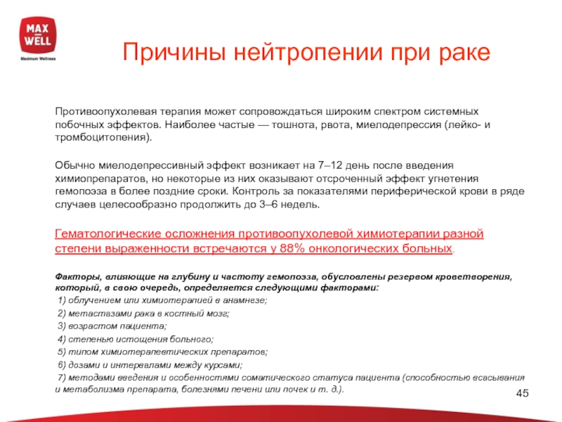 Такие агрессивные виды лечения, как химио- и радиотерапия, серьезно повреждают эти быстроразмножающиеся клетки; развивается нейтропения — понижение уровня нейтрофилов.