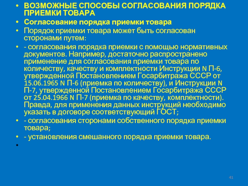 Для согласования условия о приемке стороны должны договориться о том, какие правила и процедуры приемки они будут применять, и определить способ их согласования (ссылка на нормативные акты или разработка собственных правил).