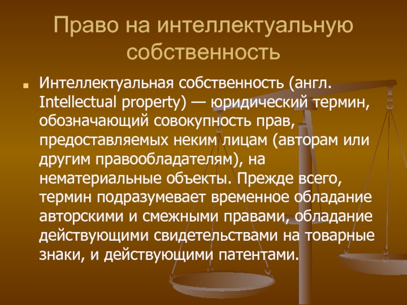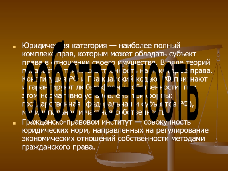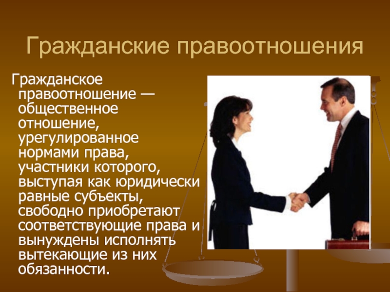 В России — отрасль права, регулирующая имущественные, а также личные неимущественные отношения на основе принципов равенства, неприкосновенности всех форм собственности и свободы заключения договоров их участниками, недопустимости произвольного вмешательства кого-либо в частные дела, необходимости беспрепятственного осуществления гражданских прав, обеспечения восстановления нарушенных прав, их судебной защиты; гражданское право является ядром частного права.