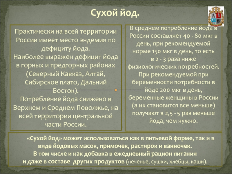 «Сухой йод» может использоваться как в питьевой форме, так и в виде йодовых масок, примочек, растирок и ванночек.