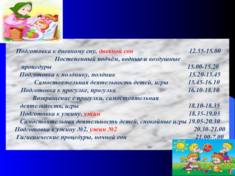 Гигиенические процедуры, ночной сон 21.00-7.00