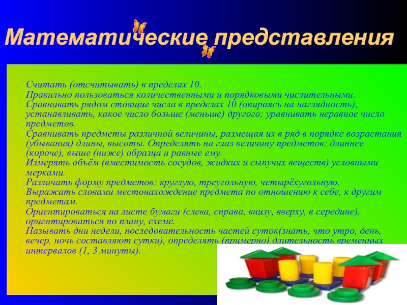 Сравнивать предметы различной величины, размещая их в ряд в порядке возрастания (убывания) длины, высоты. Определять на глаз величину предметов: длиннее (короче), выше (ниже) образца и равные ему.