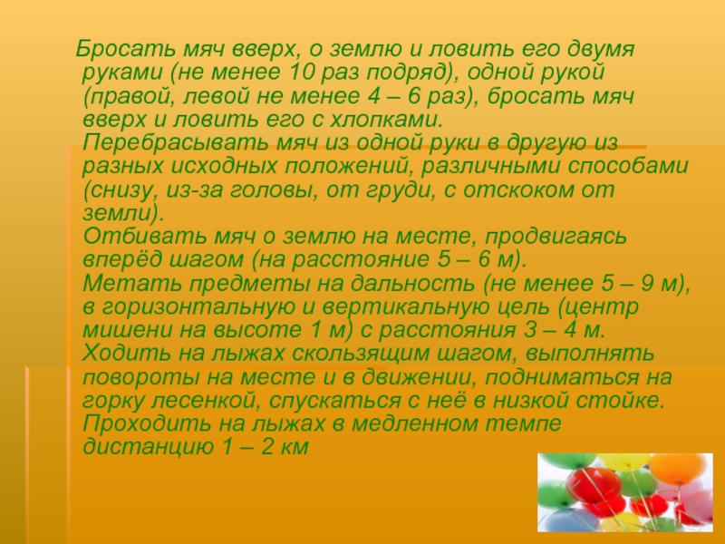 руками (не менее 10 раз подряд), одной рукой (правой, левой не менее 4 – 6 раз), бросать мяч вверх и ловить его с хлопками.