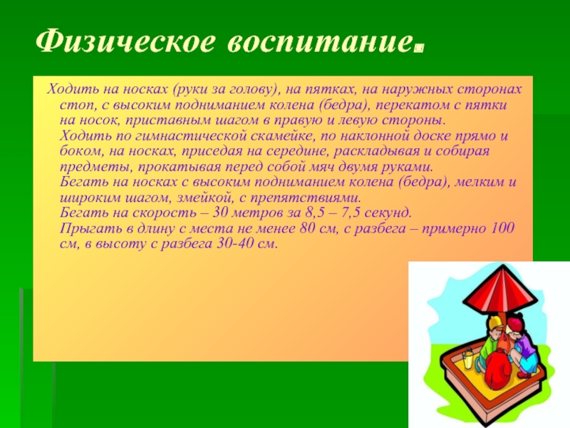 Прыгать в длину с места не менее 80 см, с разбега – примерно 100 см, в высоту с разбега 30-40 см.