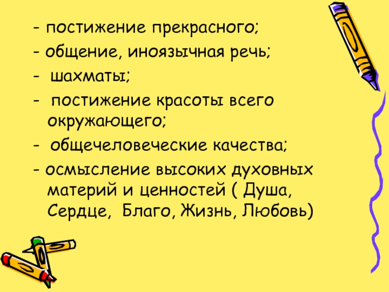 - осмысление высоких духовных материй и ценностей ( Душа, Сердце, Благо, Жизнь, Любовь)