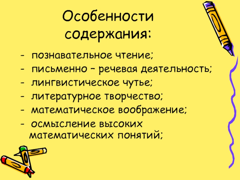 Слайд 9Особенности содержания: